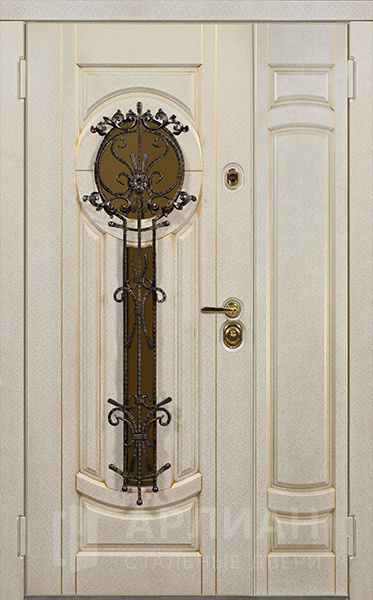 Металлическая двустворчатая дверь со стеклом и кованой решеткой №15